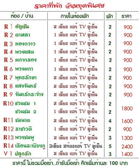 | ราคาห้องพัก วันหยุดพิเศษ (ราคาไม.. ราคาที่พัก.. ยังไม่รวมอาหารเช้า ถ้ารับมื้อเช้าคิดเพิ่มท่านละ 100 บาท