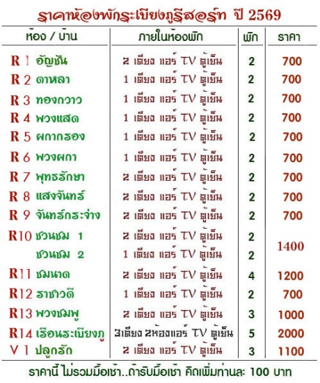 | ราคาห้องพัก ปี 2569 (ราคาไม่มีอาหาร.. ราคาห้องพักระเบียงภูรีสอร์ท พัก 2 ท่าน / 3 ท่าน/ 4 ท่าน และ 5 ท่าน |